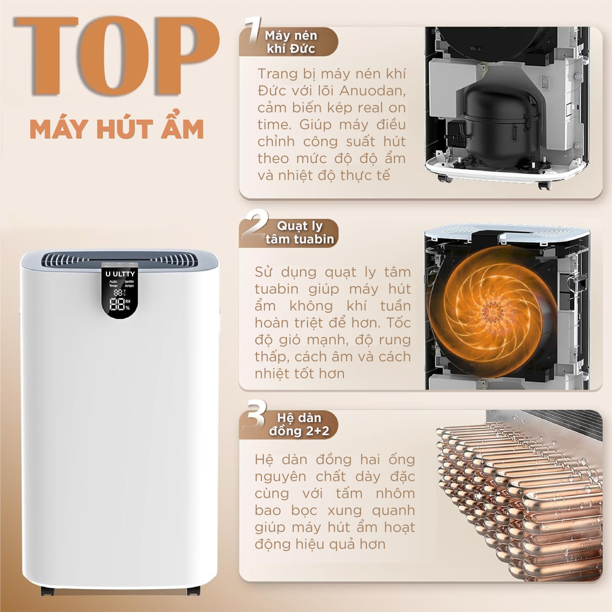 Trái tim của ULTTY Hercules là cụm máy nén khí cao cấp được sản xuất theo hệ tiêu chuẩn nghiêm ngặt của Đức. Khác với các dòng máy phổ thông, máy nén của Hercules cho phép thiết bị vận hành bền bỉ 24/7, duy trì hiệu suất ổn định ngay cả trong những ngày độ ẩm đạt đỉnh điểm mà không gặp tình trạng "đuối" máy.