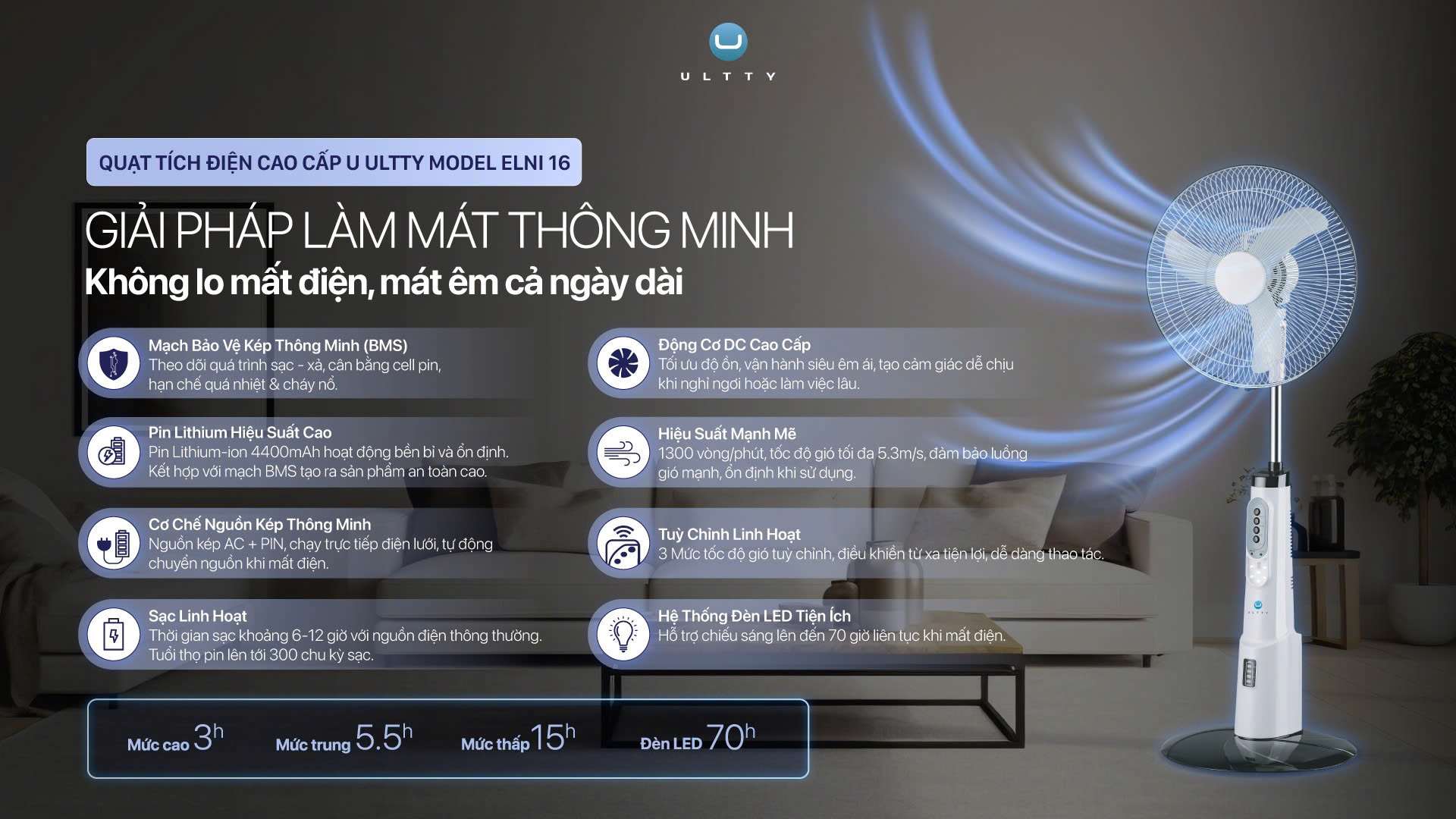 U ULTTY ELNI 16 không chỉ mang đến luồng gió êm dịu mà còn nổi bật với công nghệ bảo vệ pin thông minh, giúp gia đình bạn tận hưởng sự mát mẻ xuyên suốt lên tới 15 giờ, bất chấp mọi sự cố điện lưới.