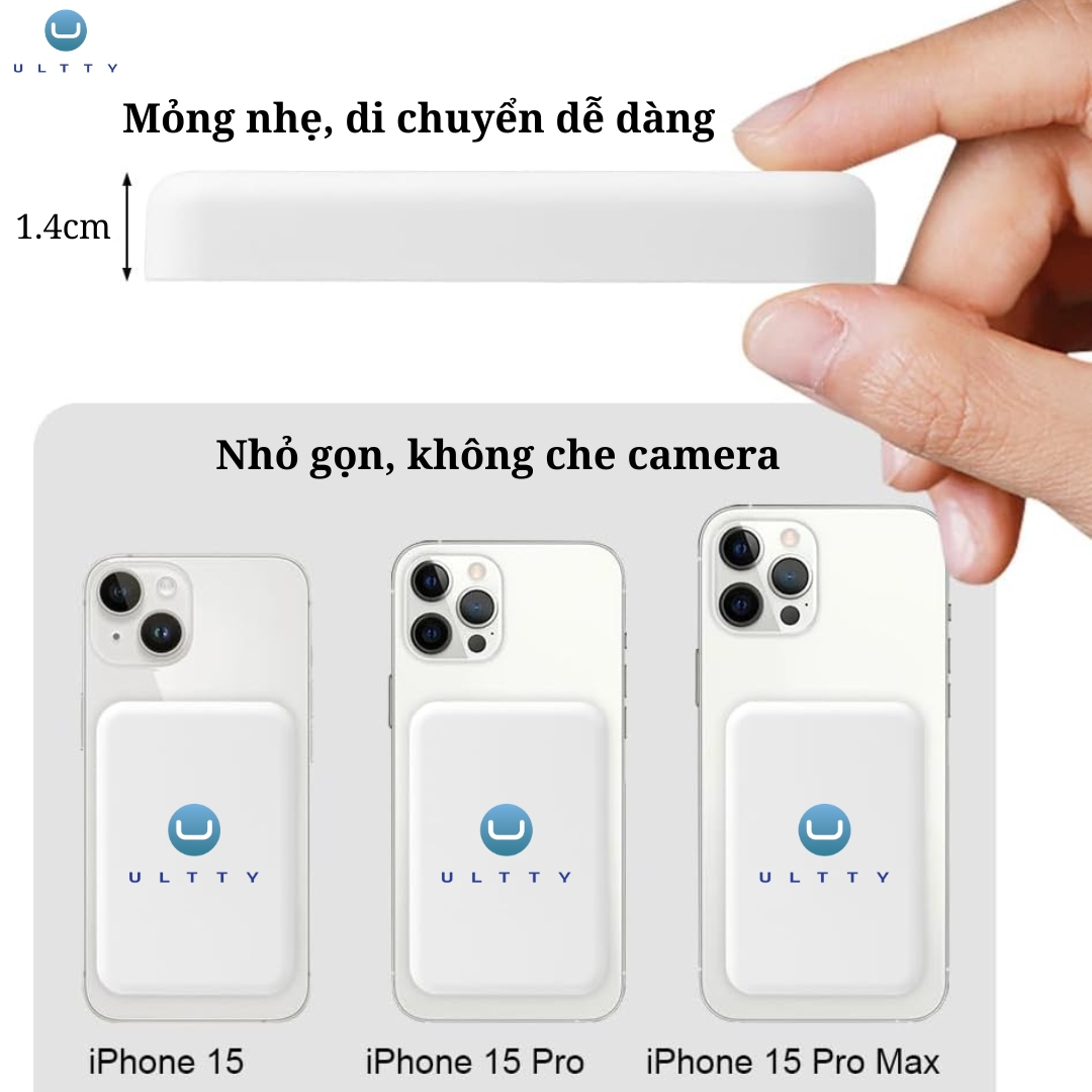 Với thiết kế siêu mỏng chỉ 14mm, pin dung lượng 5000mAh, kết hợp sạc không dây từ tính chuẩn Qi, ULTTY SG-A01 mang đến trải nghiệm “chạm nhẹ - sạc ngay” tiện lợi mọi lúc, mọi nơi, không gây nóng khi sử dụng.