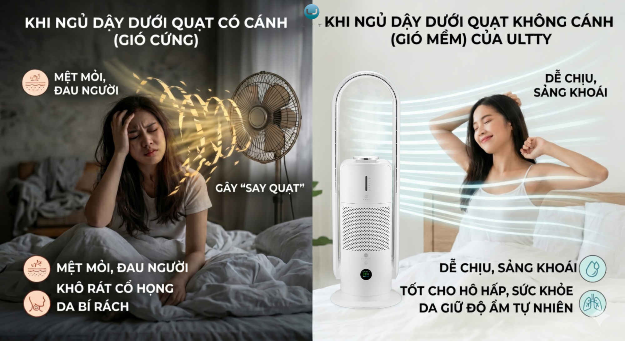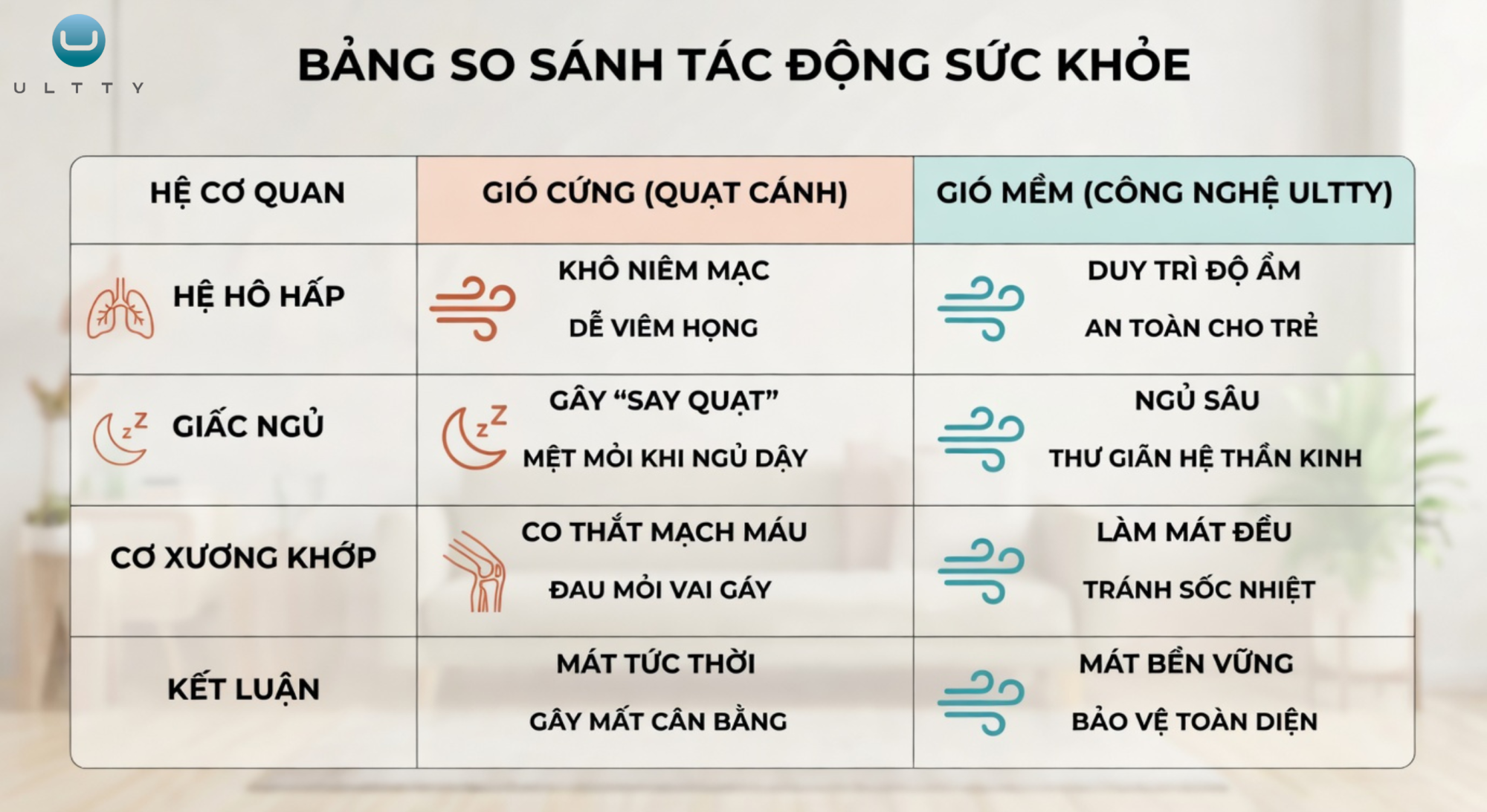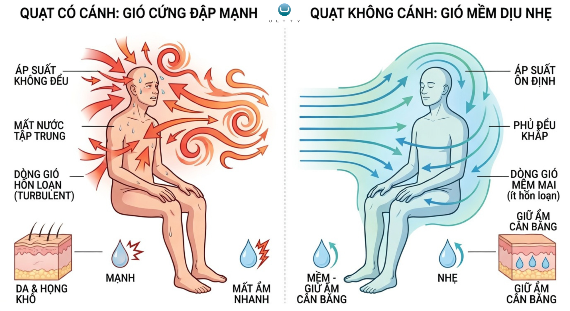 Hệ hô hấp: Gió cứng thổi trực tiếp làm khô niêm mạc mũi họng rất nhanh, dễ gây viêm họng và kích ứng xoang. Ngược lại, gió mềm ULTTY giúp duy trì độ ẩm lý tưởng, đặc biệt an toàn cho hệ hô hấp nhạy cảm của trẻ nhỏ.
